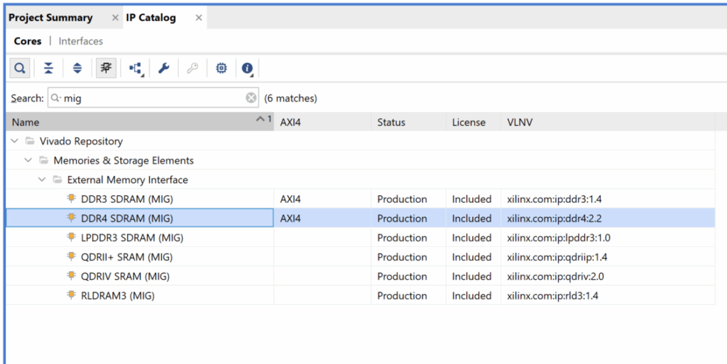 AMD/Xilinx는 Memory Interface Generator (MIG) IP 코어를 제공합니다. 이 코어는 메모리 초기화, 뱅크 관리, 명령 재정렬, 오류 정정 코드 등 고성능과 신뢰성을 보장하기 위한 복잡한 하위 레벨의 기능을 자동으로 처리해줍니다. Vivado IP Catalog를 통해, 디자인에 통합할 수 있습니다. 사용자는 IP를 통해 복잡한 PHY 와 컨틀롤러 기능을 직접 설계하지 않아도 됩니다.