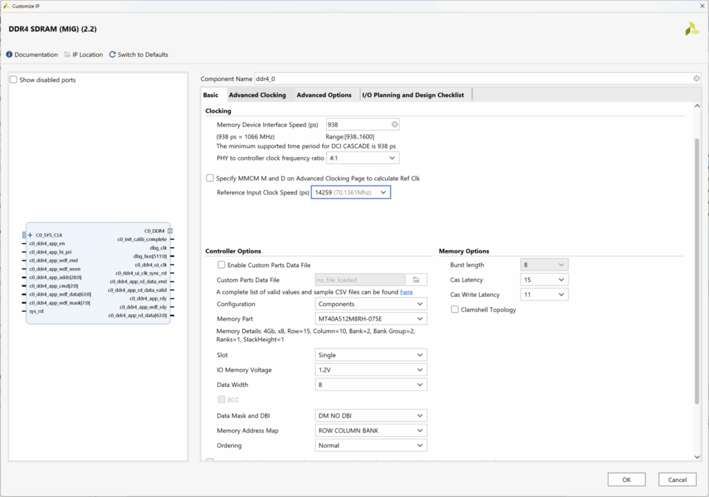 MIG 설정 화면에서는 현재 디바이스에서 구동 가능한 Memory Device Interface Speed를 확인할 수 있습니다. 예를 들어, 1066MHz라면, 1066MHz x 2 = 2132 MT/s가 되며, Data Width가 8비트이므로, 2.132GB/s가 됩니다. 즉, 1개의 DDR 단일 칩을 사용하면, 약 17Gbit/s의 대역폭을 가집니다. 따라서, 대역폭을 늘리기 위해서는 Data Width를 16, 32, 64로 늘려야 합니다.